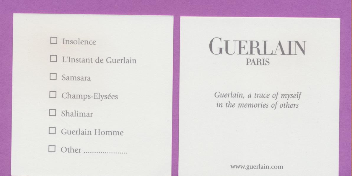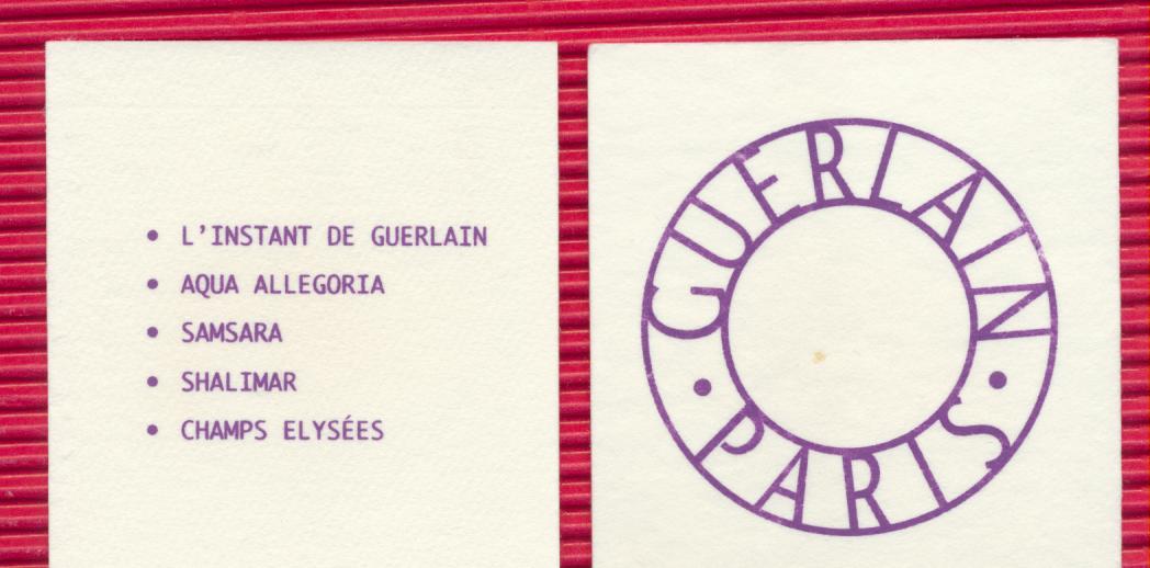 Étiquettes :Aqua-allégoria, Chamade, Champs-Elysées, Guerlain, Jardins de Bagatelle, Jicky, L'H'eure Bleue, Mitsouko, Nahema, Samsara, Shalimar, Too Much, Vol de Nuit
