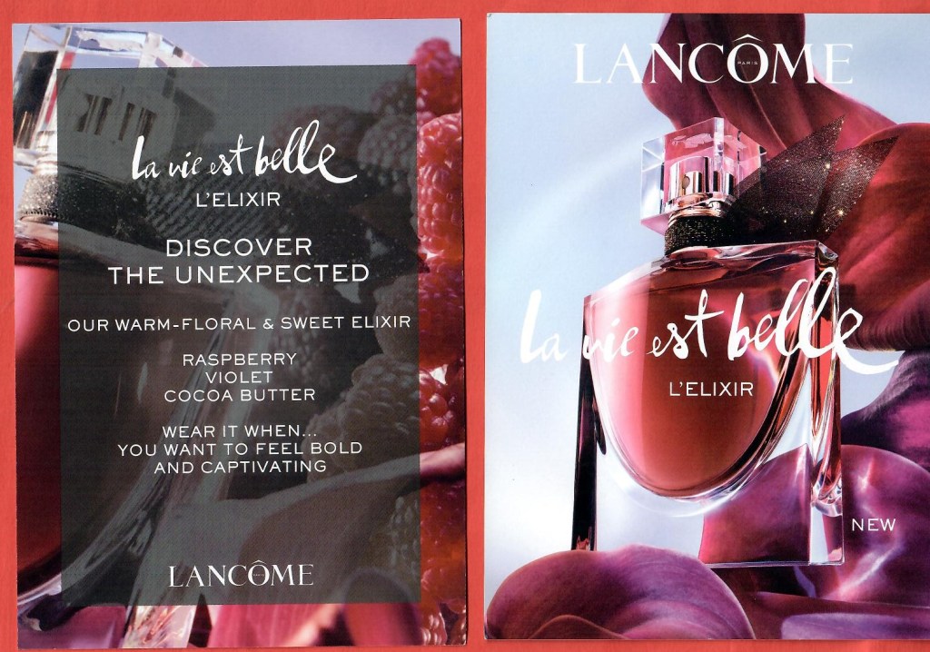 Étiquettes :La Vie est Belle, Lancome Publié dans Cartes parfumées - Perfume cards | Commentaires fermés sur Carte type postale La Vie est Belle L’Elixir (recto-verso) – USA